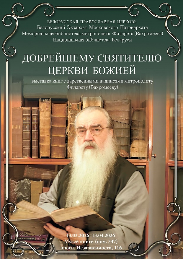 С 13 марта 2026 года в музее книги Национальной библиотеки Беларуси в рамках празднования Дня православной книги будет представлена выставка книг из фондов Мемориальной библиотеки первого Патриаршего Экзарха всея Беларуси митрополита Филарета (Вахромеева) «Добрейшему святителю Церкви Божией».